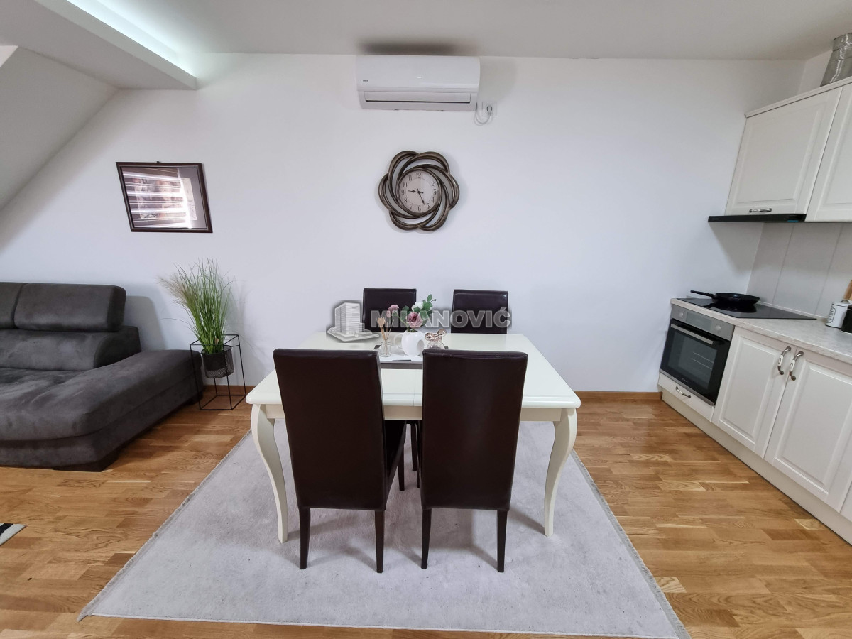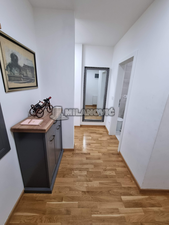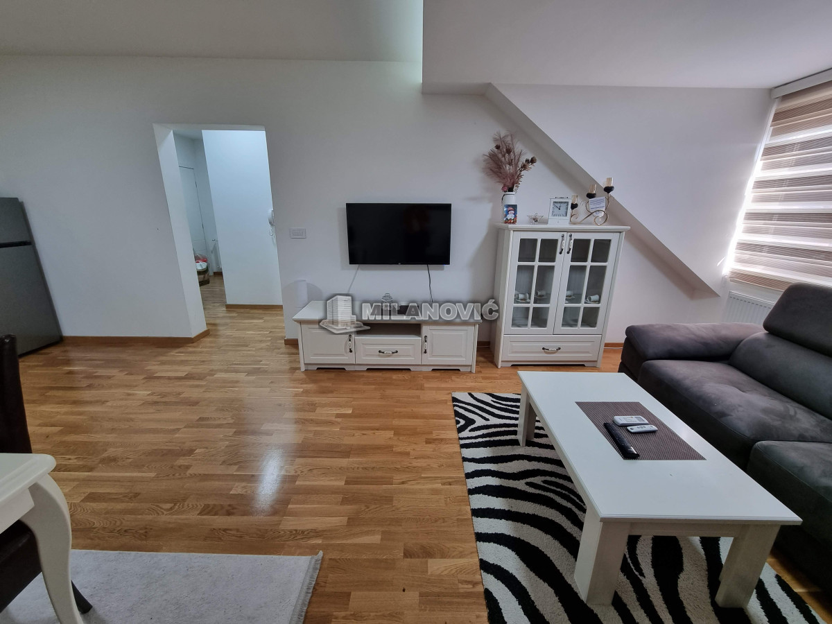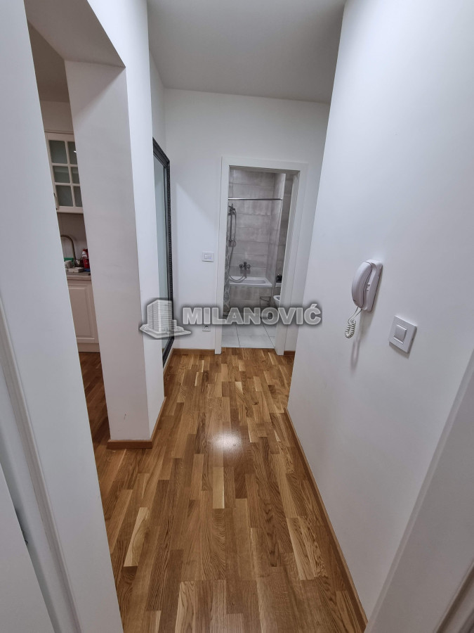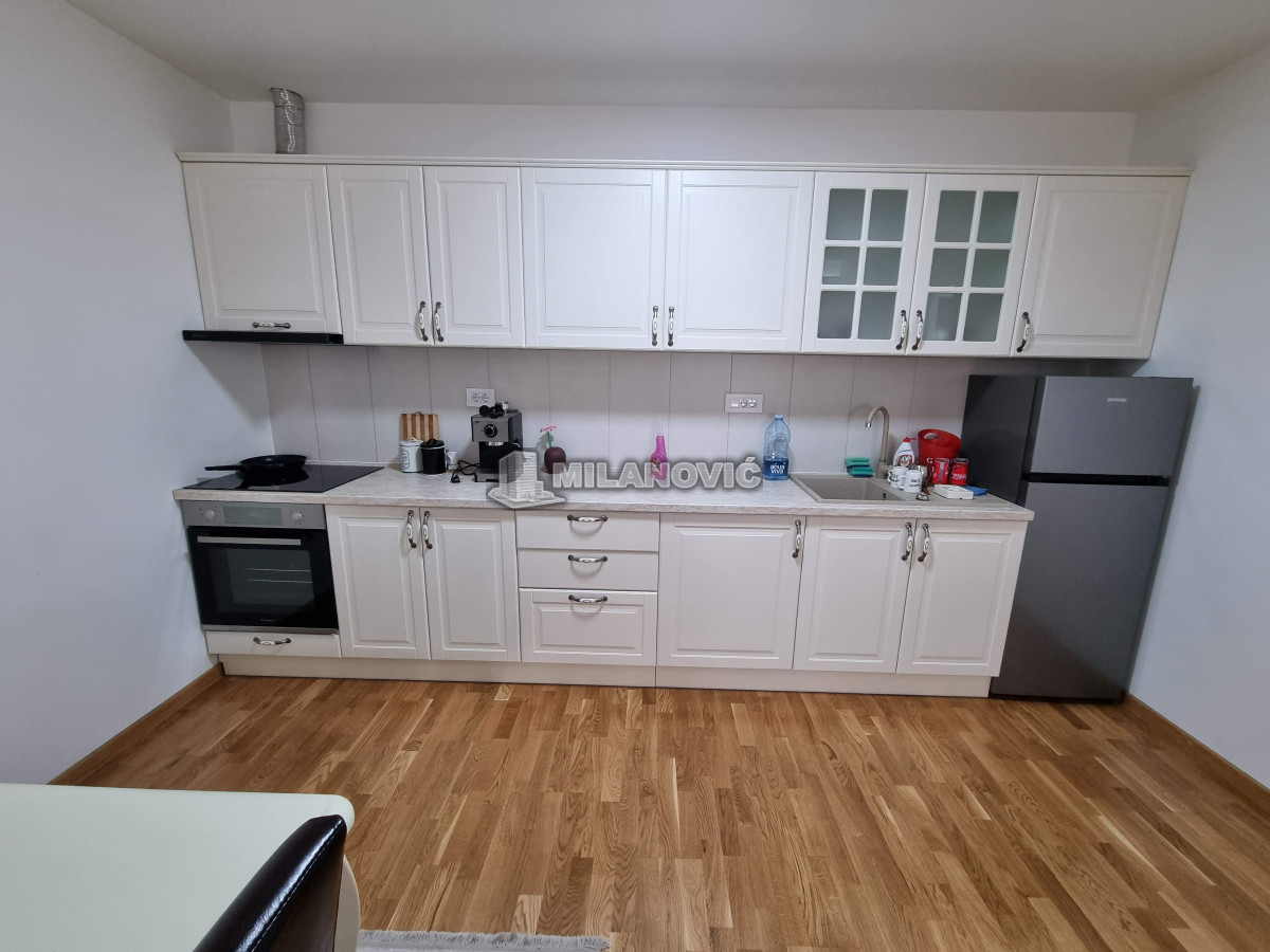 Kompletno namešten dvosoban stan u novoj zgradi. Stan ima jednu spavaću sobu i veliki dnevni boravak sa kuhinjom i trpezarijom.Ima internet u stanu nema kablovsku Tv već samo set -top box.Depozit obavezan kao i usluga agencije , ugovor o zakupu na minimum 6 meseci. Kućni ljubimci nisu dozvoljeni. Pušenje u stanu nije dozvoljeno.